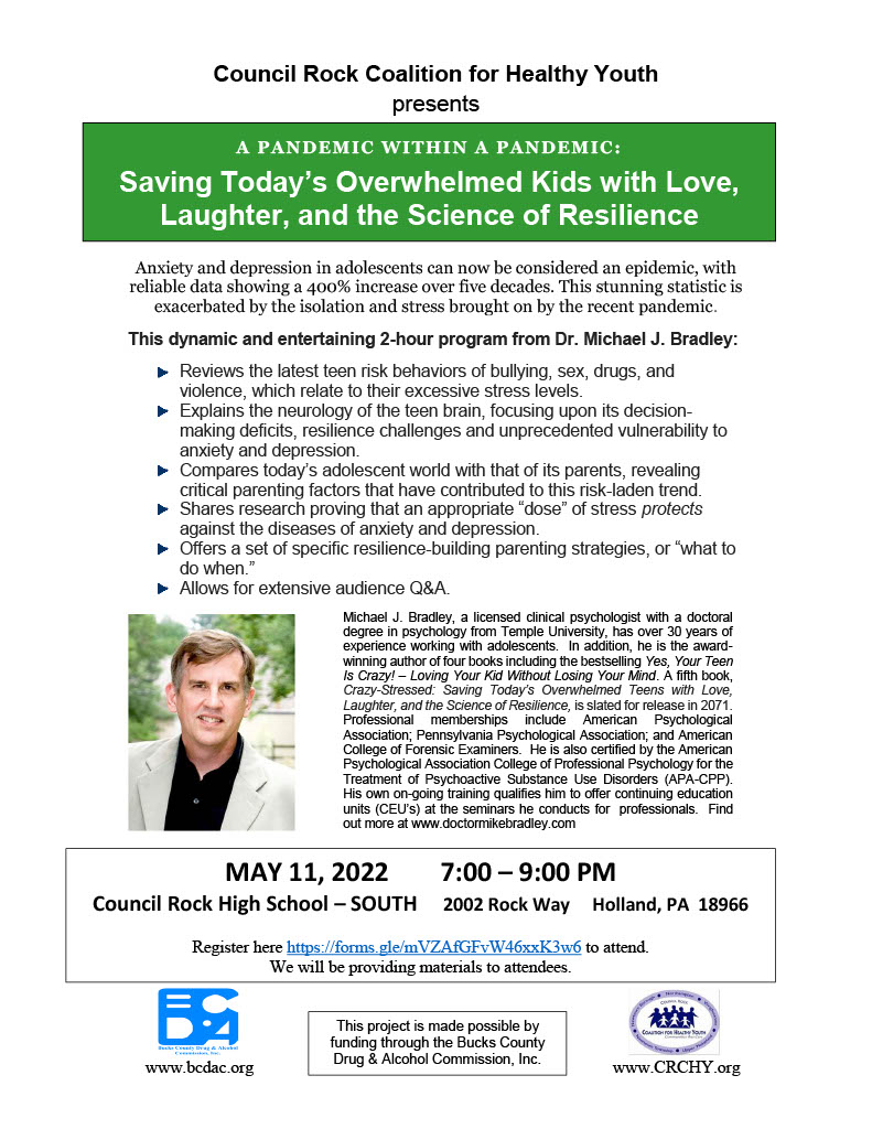 On Wednesday, May 11th at 7pm at CR South, CRCHY will host Michael Bradley, a licensed clinical psychologist with a doctoral degree in psychology from Temple University, has over 30 years of experience working with adolescents. In addition, he is the award-winning author of four books.