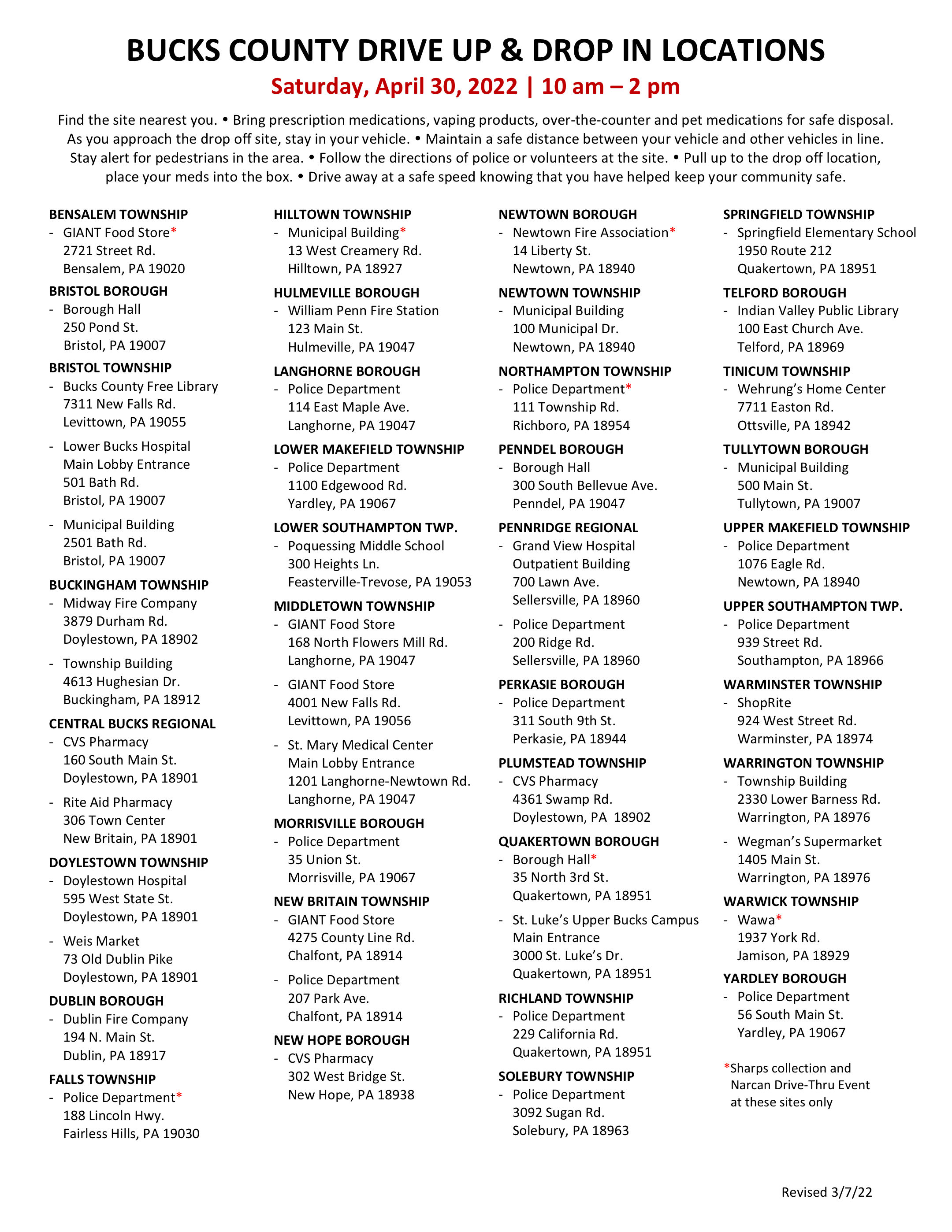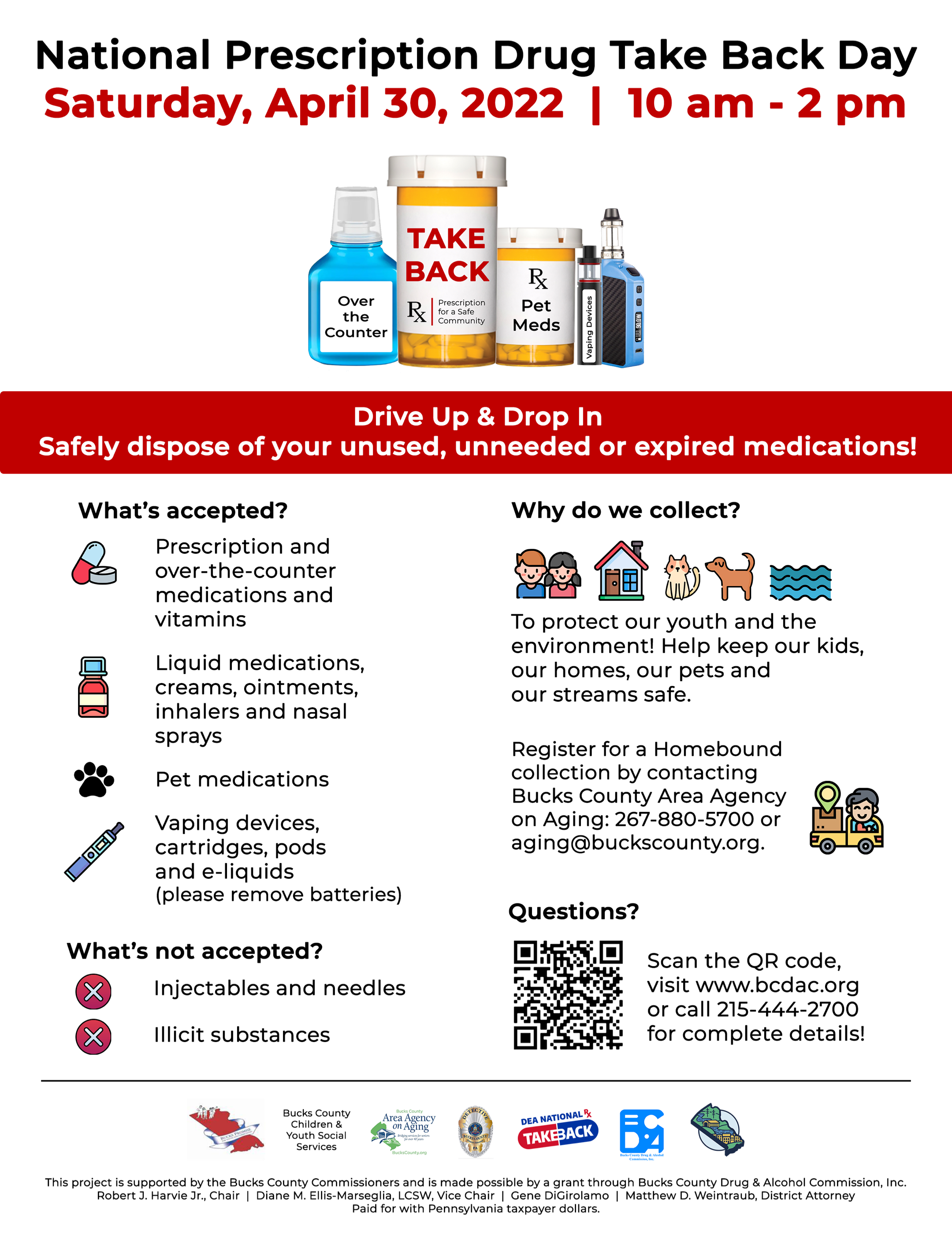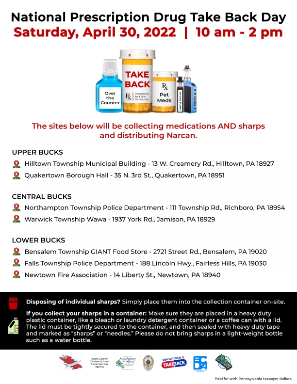 National Drug Take Back Day is Saturday, April 30th 10am-2pm. The below fliers will help you know what to bring and where to bring it in Bucks County, PA. For more information please visit the Bucks County Drug and Alcohol Commission. Hope to see you on Saturday!