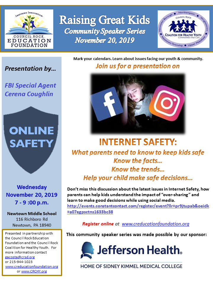 Please join us on Wednesday, November 20th at 7pm at Newtown Middle School for a special presentation on Internet Safety. FBI Special Agent Cerena Coughlin will discuss apps, personal data, digital footprint and (most importantly) how parents can help their kids stay safe while navigating the digital world.