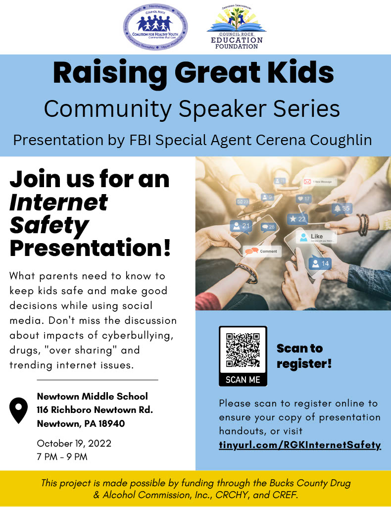 Join us for an Internet Safety Presentation by FBI Special Agent Cerena Coughlin – What parents need to know to keep kids safe and make good decisions while using social media. Don’t miss the discussion about impacts of “over sharing” and trending internet issues.